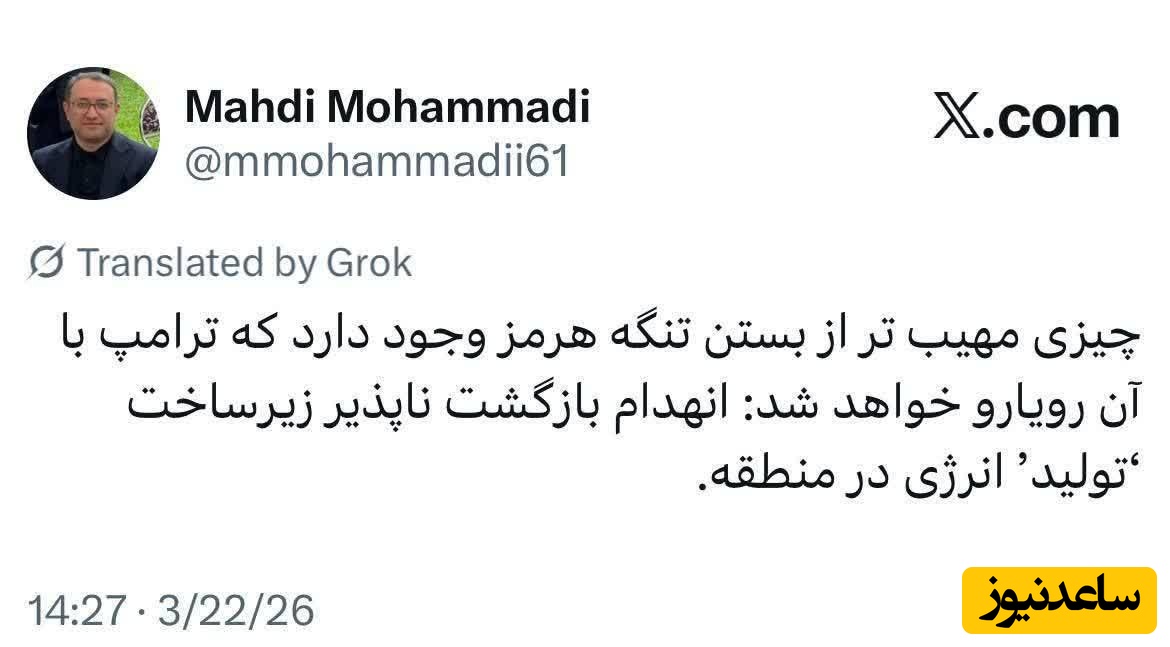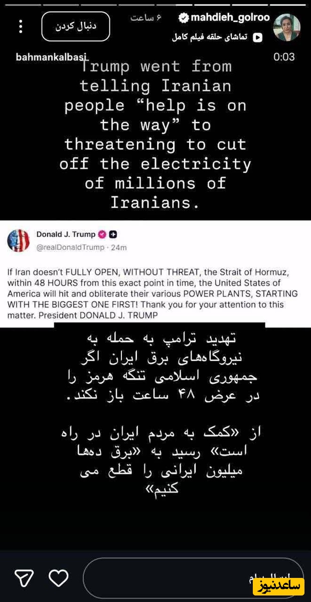 🔹رئیس جمهور آمریکا که چندی پیش مدعی حمایت از مردم ایران شده بود، ادعا کرد: ایران بهطور کامل نابود خواهد شد و این بهخوبی موفق خواهد بود! ایران به مدت 47 سال بسیار بد بوده و اکنون مجازات شایستهاش را دریافت میکند.