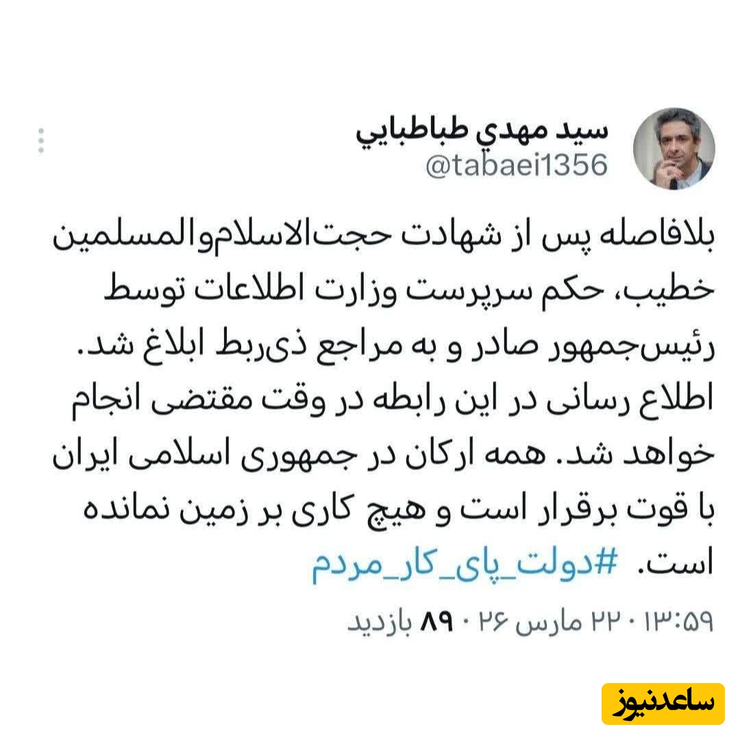 🔹مجمع وزیران ادوار مرکب از بیش از 250 نفر از وزرا، معاونان روسای جمهور دولتهای چهاردهم، ضمن عرض تبریک اعیاد ملی و دینی نوروز باستانی و عید سعید فطر متواضعانه به ملت آزاده ایران و شهدای گرانقدر آن، اعم از دختران معصوم مدرسه شهدای شاهچراغ و سایر شهدای مدافعان امنیتی و اطلاعاتی ادای احترام میکند و علیرغم گرایشهای متنوع و متفاوت، به صورت یکپارچه و منسجم بر عهد دیرین خود مبنی بر خدمت به مردم شریف ایران از طریق نظام جمهوری اسلامی ایران، تحت رهبری امامین انقلاب پای میفشارد و آمادگی خود را در کمک به دولت موفق چهاردهم، تحت زعامت حضرت آیتالله سید مجتبی حسینی خامنهای اعلام میدارد و همچنان منتظر تحقق این وعده تخلفناپذیر الهی در حق مجرمان پرونده انستین هست که: