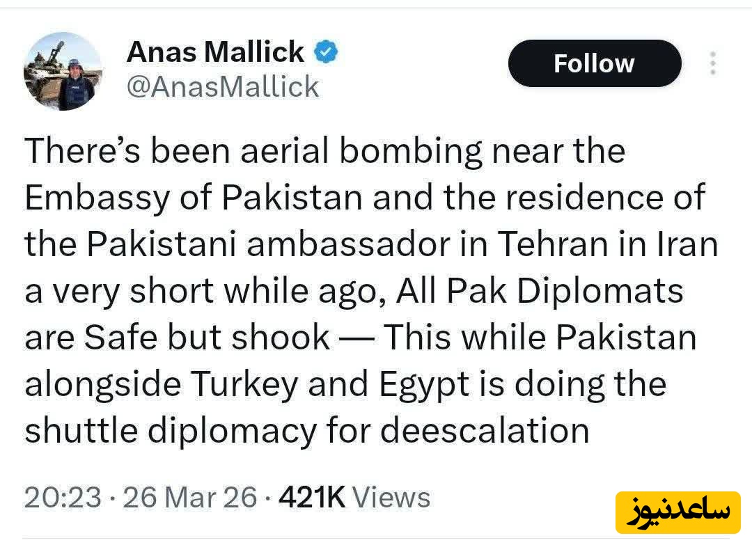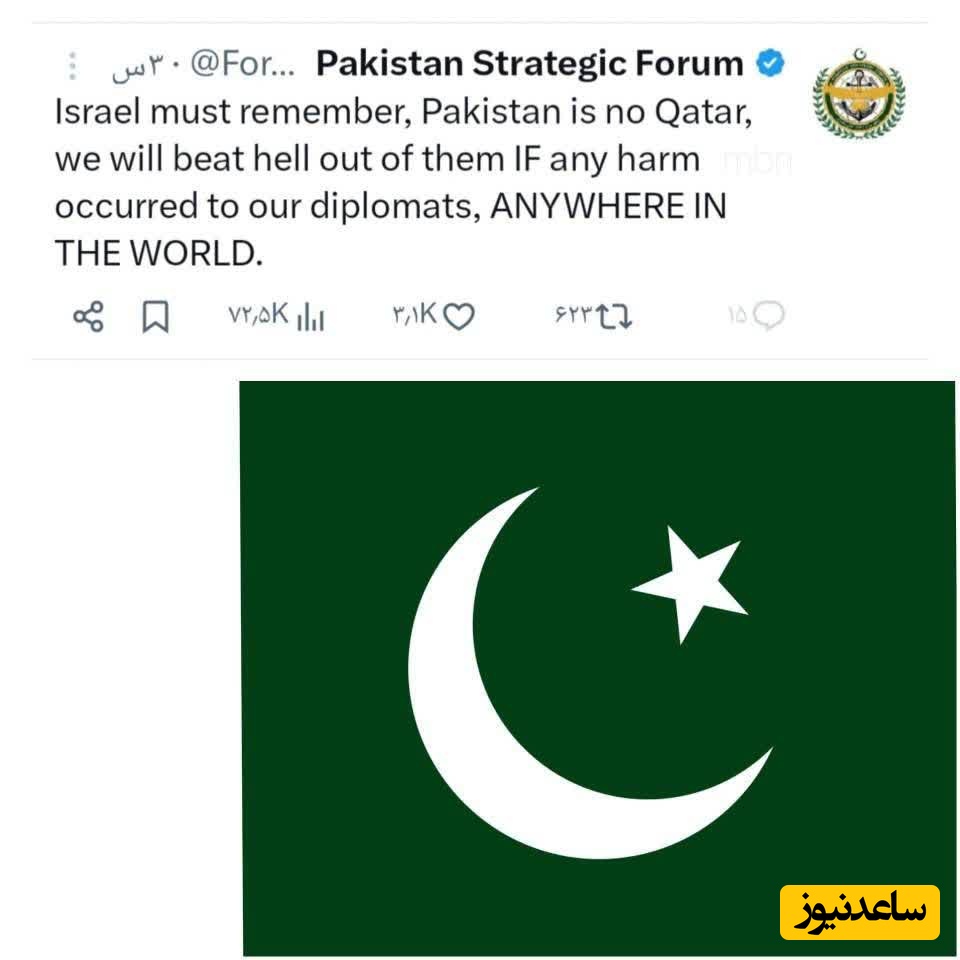 🔹حساب «مجمع استراتژیک پاکستان» وابسته به دولت این کشور در شبکه ایکس نوشت: اسرائیل باید به خاطر داشته باشد، پاکستان قطر نیست، اگر آسیبی به دیپلماتهای ما در هر کجای دنیا برسد، آنها را به شدت کتک خواهیم زد.