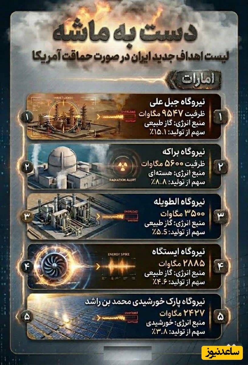 🔹کارشناسان معتقدند با توجه به وابستگی شدید بخشهای صنعتی، شیرینسازی آب و مراکز داده (Technology Hubs) این کشور به پایداری شبکه برق، هرگونه اصابت به این اهداف، نه تنها منجر به خاموشی گسترده، بلکه باعث فروپاشی زنجیره تامین اقتصادی و توقف فعالیتهای تجاری در منطقه خلیج فارس خواهد شد.