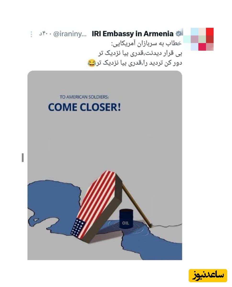 🔹نیروهای بزدل آمریکایی صهیونیستی که جرات و توانایی دفاع از پایگاه های نظامی خودشان را ندارند از ترس آتش زمندگان اسلام با استفاده از اماکن غیرنظامی تلاش دارند از مردم بی گناه به عنوان سپر انسانی استفاده نمایند از آنجا که ما تکلیف داریم نیروهای تروریست آمریکا و رژیم غاصب را که بی محابا به کشتار غیرنظامیان ایرانی و ترور شخصیت ها دست می زنند را هر جا یافتیم از بین ببریم توصیه می کنیم با فوریت اماکن محل استقرار نیروهای آمریکایی را ترک کنید تا آسیبی به شما نرسد.