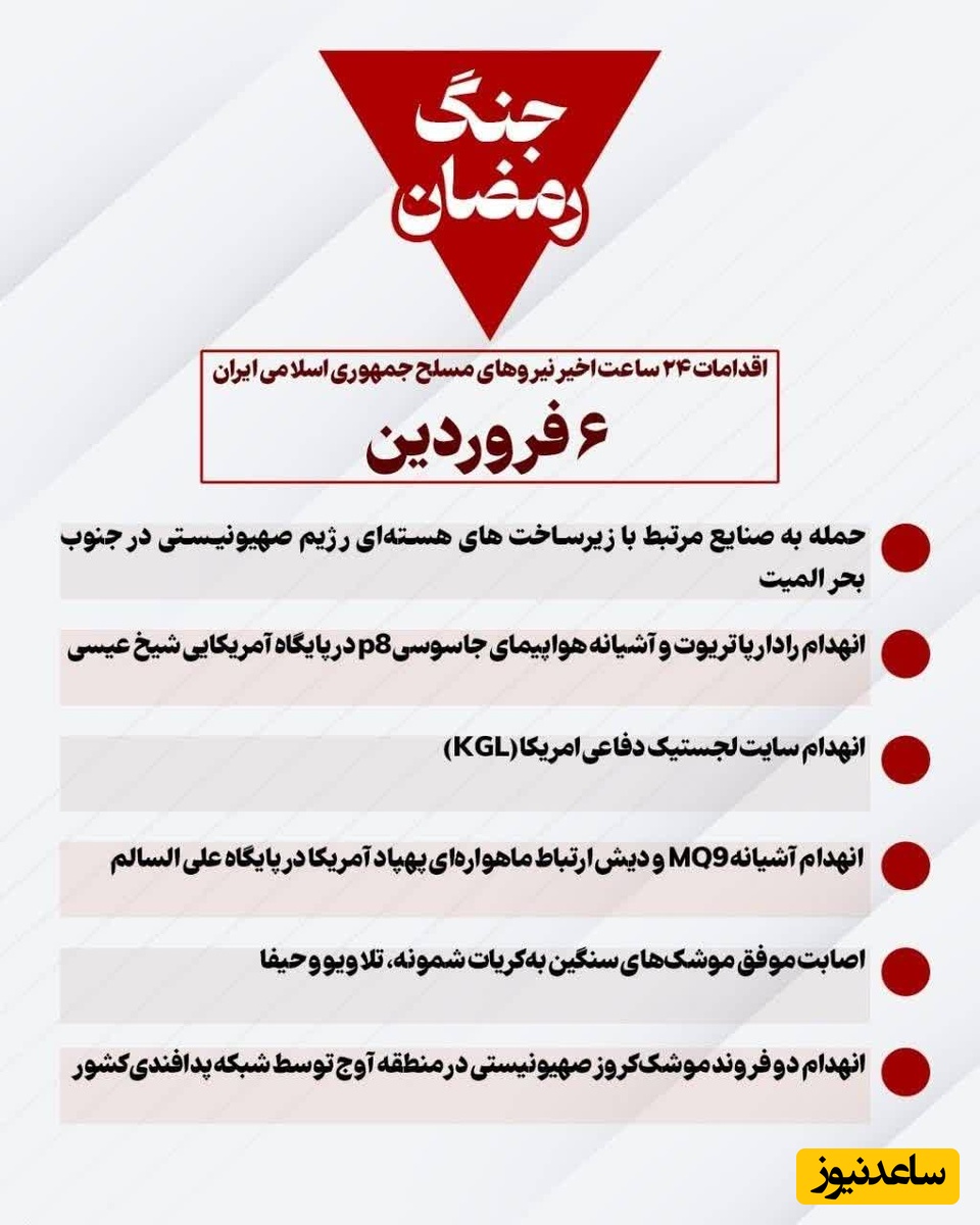 🔹عملیات پیوسته و مشترک موشکی و پهپادی نیروهای دریایی و هوافضای سپاه پاسداران در موج 83 عملیات وعده صادق 4 با تقدیم به مردم خون گرم نوار جنوبی کشور در شمال خلیج همیشه فارس با رمز مقدس «یا اباعبدالله الحسین علیه السلام» در شامگاه پنجم شنبه علیه اهداف دشمن آمریکایی صهیونیستی شامل مخازن ذخیره و انبار نفت اشدود، محل استقرار نظامیان ارتش کودک کش صهیونی در شهرک مُدعین، مرکز تبادل اطلاعات نظامی آمریکا در منطقه و پایگاه های ارتش تروریستی آمریکا در الظَفره والعدیری، آشیانههای نگهداری و تعمیرات هواپیماهای ترابری و پهپادهای در پایگاه علی السالم ، مخازن سوخت جتها و جنگنده های نیروهای تروریستی آمریکا و آشیانه تعمیرات و نگهداری سامانه پاتریوت در پایگاه شیخ عیسی با سامانه های برد بلند و میان برد، سوخت جامد و مایع، نقطه زن و سرجنگی چند کلاهکه و پهپادهای انهدامی و پرسه زن به اذن الهی با موفقیت کامل به اجرا در آمد.