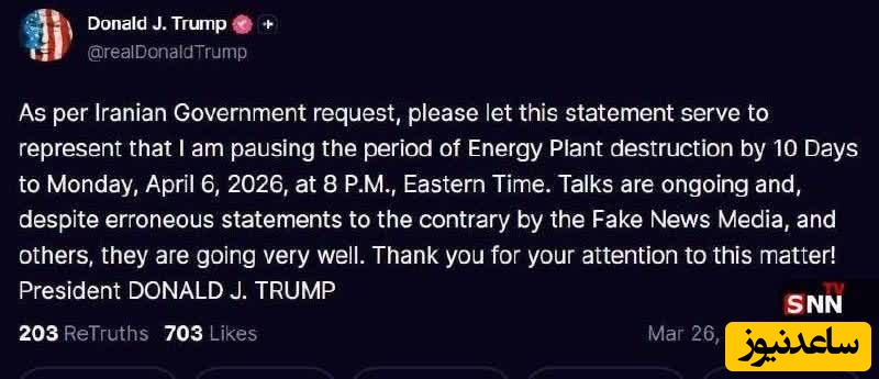 🔹بنا به درخواست دولت ایران، بدینوسیله اعلام میدارم که روند تخریب تأسیسات انرژی را به مدت 10 روز، تا روز دوشنبه 6 آوریل 2026، ساعت 8 شب به وقت واشینگتن دیسی، به تعویق میاندازم. مذاکرات همچنان در جریان است و برخلاف گزارشهای نادرست رسانههای دروغپرداز (فیکنیوز) و دیگران، این گفتگوها بسیار خوب پیش میرود. از توجه شما به این موضوع سپاسگزارم.