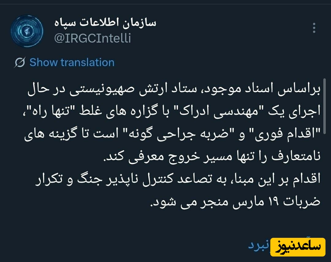 به گزارش سرویس سیاست پایگاه خبری ساعدنیوز، به نقل از خبرآنلاین، سازمان اطلاعات سپاه در شبکه اجتماعی ایکس نوشت: