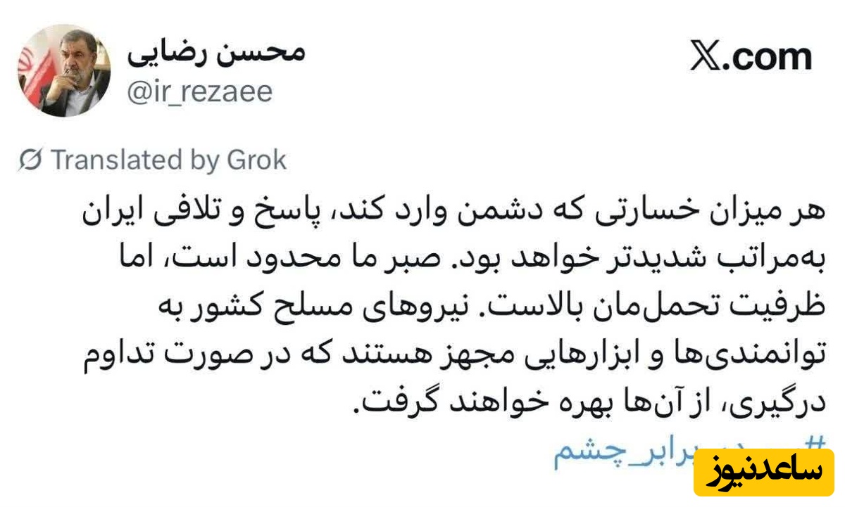 🔹هر میزان خسارتی که دشمن وارد کند، پاسخ و تلافی ایران بهمراتب شدیدتر خواهد بود. صبر ما محدود است، اما ظرفیت تحملمان بالاست. نیروهای مسلح کشور به توانمندیها و ابزارهایی مجهز هستند که در صورت تداوم درگیری، از آنها بهره خواهند گرفت.