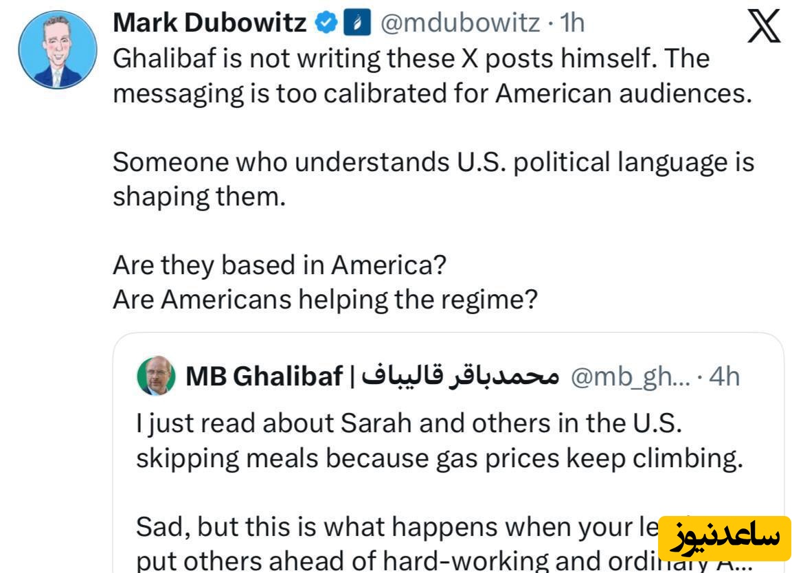 به گزارش سرویس سیاسی پایگاه خبری ساعدنیوز، مارک دوبوویتز رییس بنیاد ضد ایرانی دفاع از دموکراسی ها در واکنش به توییت اخیر قالیباف خطاب به شهروندان امریکایی گفته: