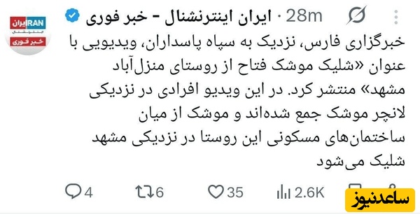 «در روستای منزلآباد مشهد، موشکی از میان غیرنظامیان شلیک شده و از مردم بهعنوان سپر انسانی استفاده شده است.» درحالیکه در تجمع مردمی این روستا، اهالی برای تشکر از نیروهای هوافضا یک ماکت ساخته و آتش روشن کردند. خبرگزاری فارس هم این حرکت نمادین را با تیتر «شلیک موشک فتاح» پوشش داده بود.