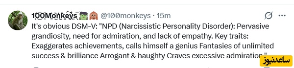 قشنگ مشخصه که این آدم اختلال شخصیت خودشیفته (NPD) داره: خودبزرگبینی فراگیر، نیاز به تحسین و فقدان همدلی. ویژگیهای کلیدی این بیماری : در دستاوردها اغراق میکند، خود را نابغه مینامد. خیالپردازیهایی در مورد موفقیت و درخشش نامحدود دارد. متکبر و مغرور است. تشنه تحسین بیش از حد است.»