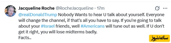 هیچکس نمیخواهد حرفهایت را در مورد خودت بشنود. اگر در این مورد حرف بزنی ، همه کانال را عوض میکنند. اگر قرار است در مورد دوستان #اسرائیلی خود صحبت کنی، خب #آمریکاییها هم بیتوجه میشوند. اگر به خودت نیایی، انتخابات میاندورهای را به شدت خواهی باخت.