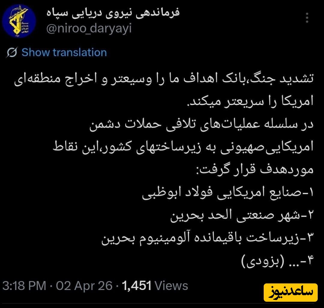 به گزارش سرویس سیاست پایگاه خبری ساعدنیوز، خبرآنلاین، فرماندهی نیروی دریایی سپاه پاسداران در شبکه اجتماعی ایکس نوشت: