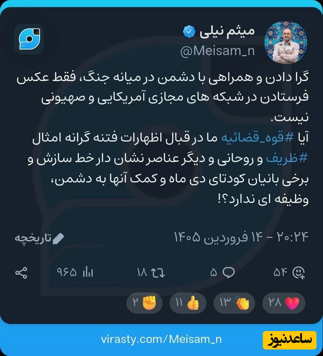 به گزارش سرویس چندرسانهای پایگاه خبری ساعدنیوز، به نقل از خبرآنلاین، میثم نیلی ، برادر داماد شهید رئیسی در راستای موجی حملات به ظریف به خاطر مقاله اخیر وی در نشریه فارن افرز، وزیر خارجه پیشین را به گرا دادن به دشمن در میانه جنگ متهم کرد و از قوه قضاییه خواست که با او برخورد کند.
