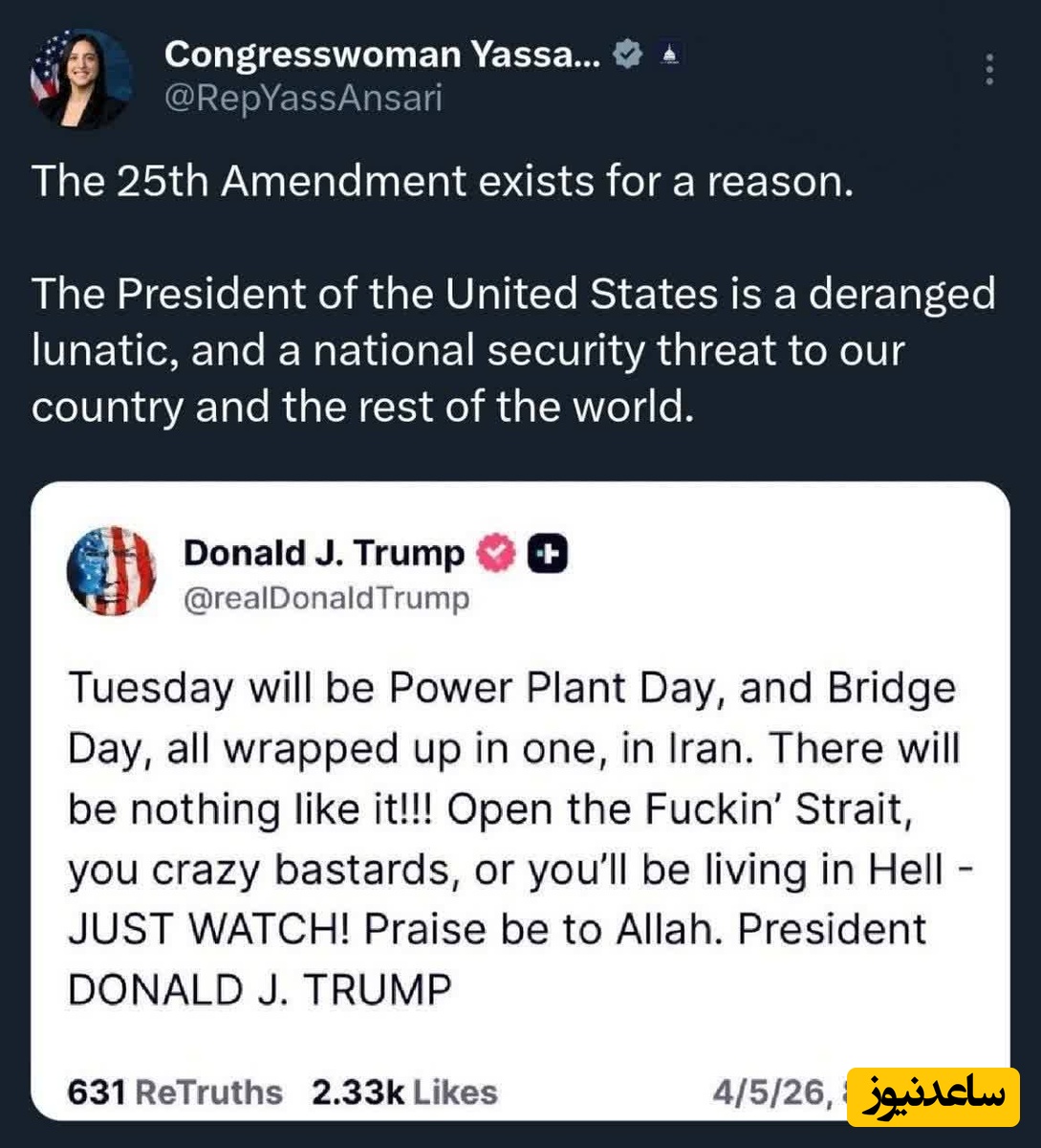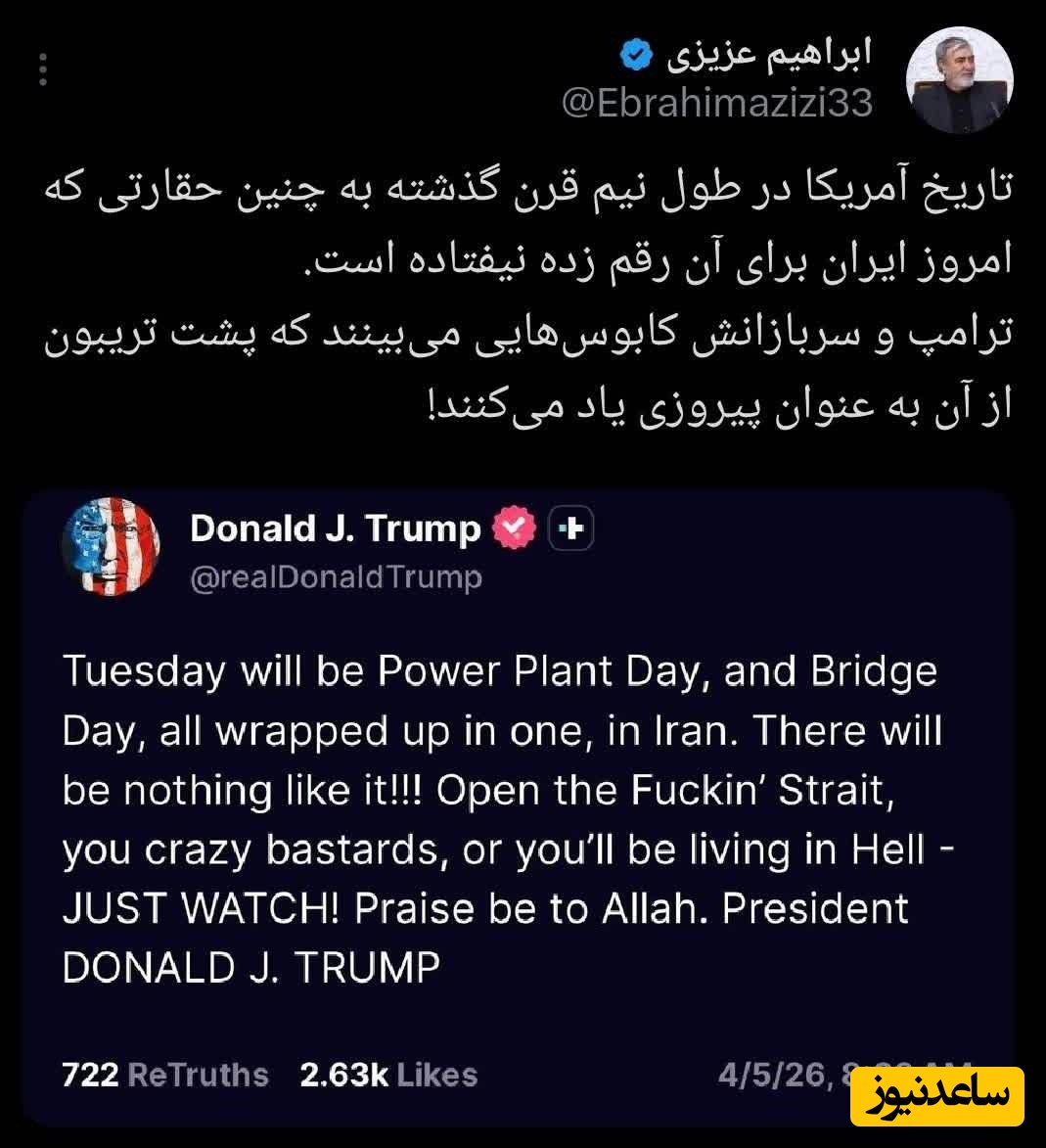 🔹استفاده رئیسجمهور قدرتمندترین کشور دنیا! از ادبیات رکیک و تهدیدهای عریان ضدانسانی و جنایتکارانه، تصویر کاملی از شکست، ناکامی و استیصال است.