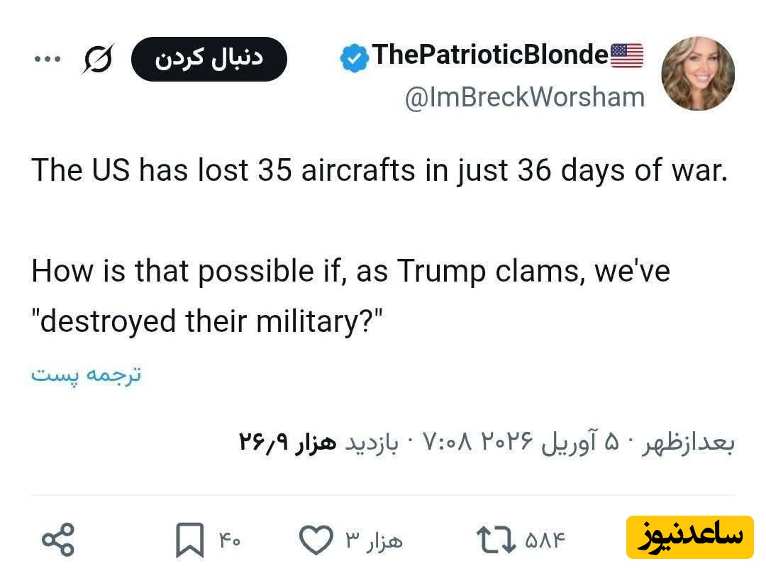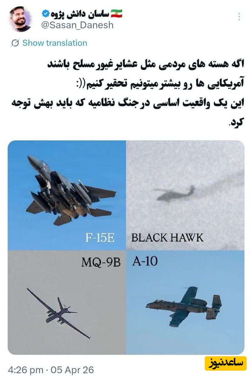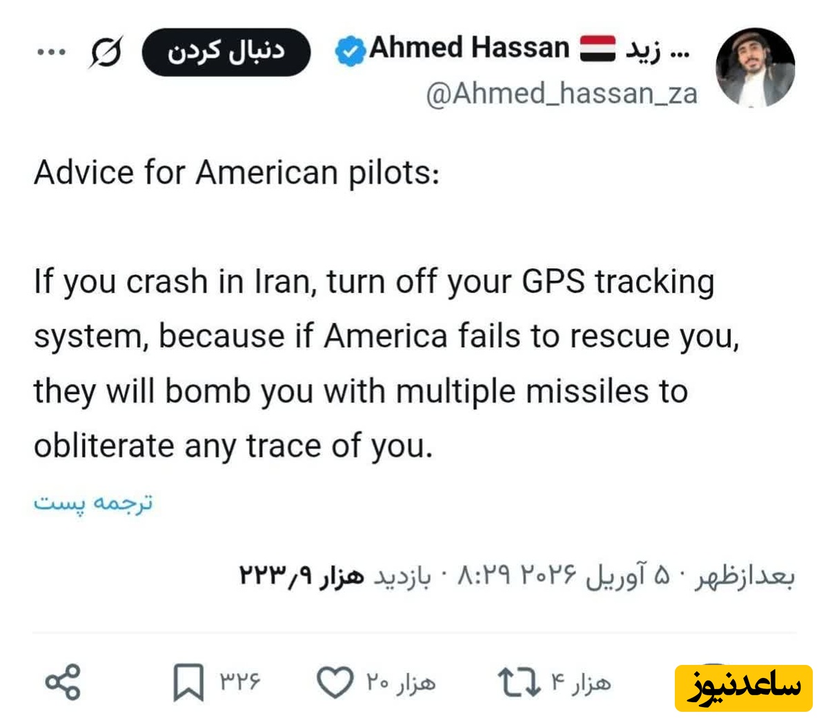 توصیه برای خلبانان آمریکایی: اگر در ایران سقوط کردید، سیستم ردیابی GPS خود را خاموش کنید، زیرا اگر آمریکا نتواند شما را نجات دهد، آنها شما را با موشکهای متعدد بمباران خواهند کرد تا هرگونه اثری از شما را از بین ببرند.