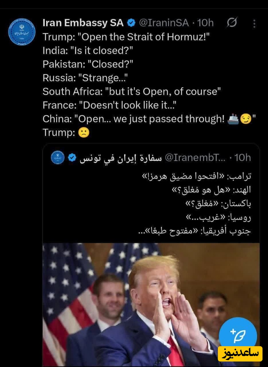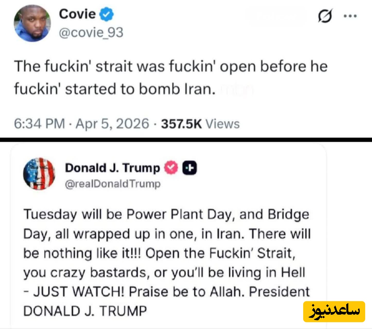 🔹او روز چهارشنبه گفت ما به تنگهٔ هرمز نیازی نداریم، حالا میگوید تنگه را باز کنید وگرنه جهنم بهپا خواهد شد.