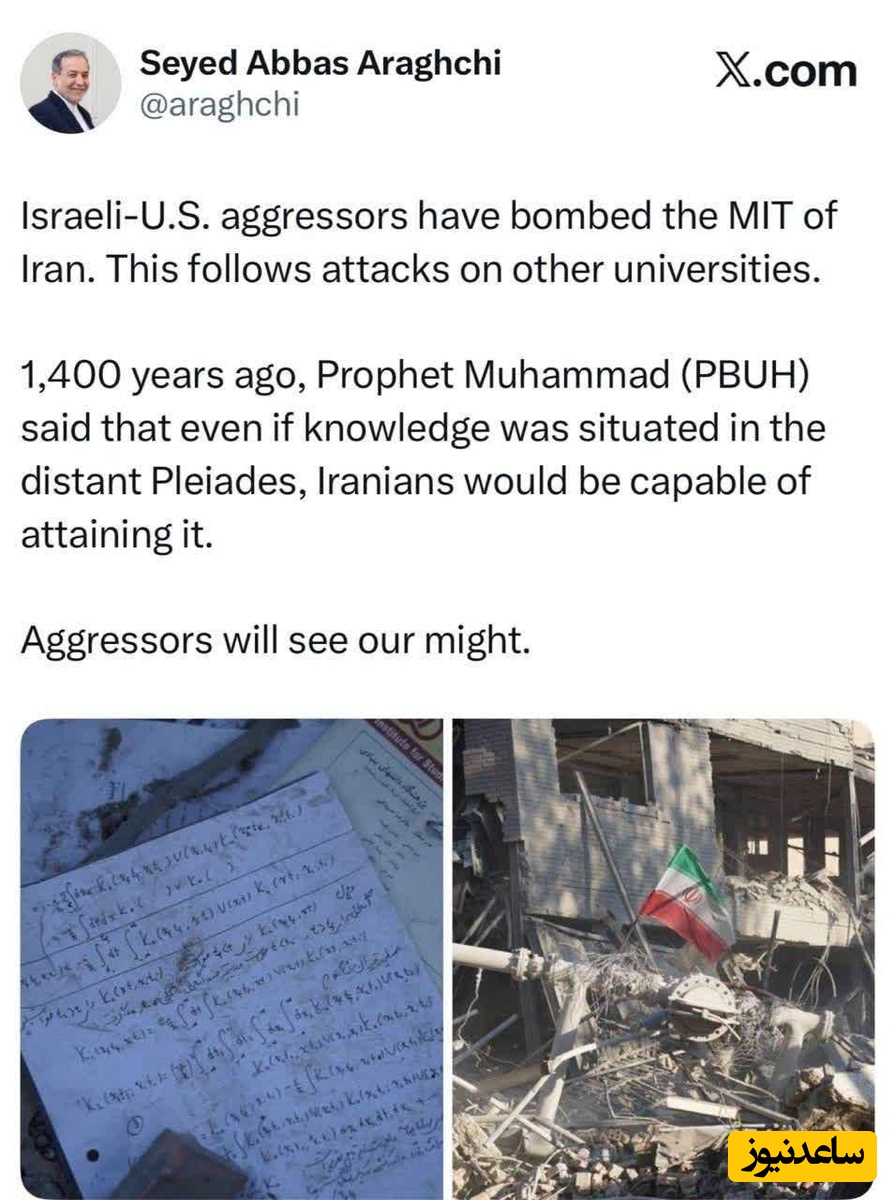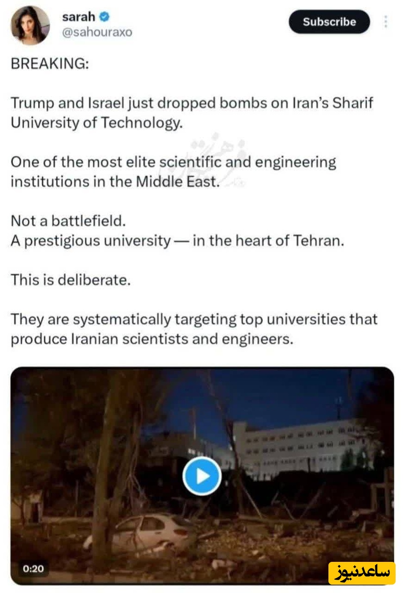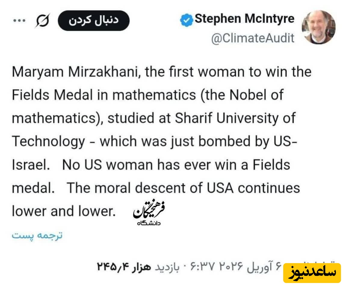 استاد دانشگاه آمریکایی: مریم میرزاخانی، اولین زنی که مدال فیلدز در ریاضیات را برنده شد، در دانشگاه صنعتی شریف تحصیل کرد که این دانشگاه به تازگی توسط ایالات متحده و اسرائیل بمباران شد. هیچ زن آمریکایی تاکنون مدال فیلدز را برنده نشده است.