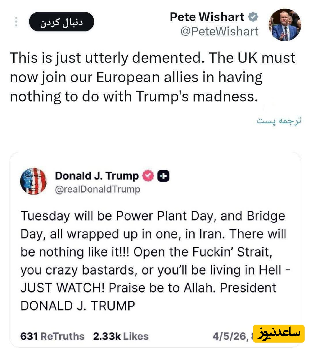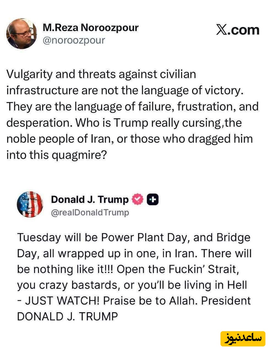 یک توییت بیپروا و پر از الفاظ رکیک که تهدید به جنایت جنگی میکند، تنگه هرمز را باز نخواهد کرد. تنها چیزی که این کار را میکند، مذاکره با ایران است. از همان راهی شروع کن که آخرش مجبور میشوی به سراغ آن بروی دونالد؛ تا آمریکاییها مجبور نباشند بنزین را گرانتر بخرند و نیروهای نظامی ما هم جانشان را از دست ندهند.
