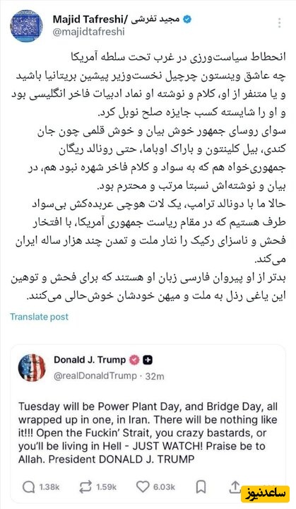 به گزارش سرویس سیاست پایگاه خبری تحلیلی ساعدنیوز، مجید تفرشی در این پست با عنوان «انحطاط سیاست ورزی در غرب تحت سلطه امریکا» نوشته است: چه عاشق وینستون چرچیل نخست وزیر پیشین بریتانیا باشید و یا متنفر از او، کلام و نوشته او نماد ادبیات فاخر انگلیسی بود و او را شایسته کسب جایزه صلح نوبل کرد.