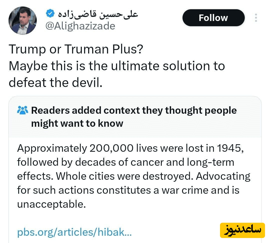این عنصر معاند در حساب کاربری خود در ایکس نوشت: «ترامپ یا «ترومن پلاس»؟ شاید این راهحل نهایی برای شکست دادن شیطان باشد.»