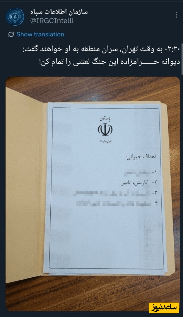به گزارش سرویس سیاسی پایگاه خبری ساعدنیوز، اکانت سازمان اطلاعات سپاه در شبکه اجتماعی ایکس اعلام کرد: 03:30 به وقت تهران؛ سران منطقه به او خواهند گفت: دیوانه حرامزاده این جنگ لعنتی را تمام کن!