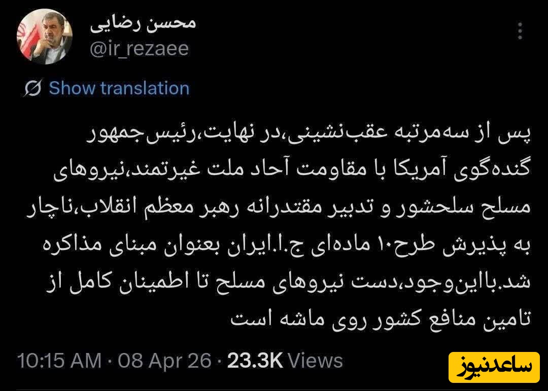 🔹ایران ده شرط برای این مسئله گذاشته است؛ البته این بدین معنا نیست که جنگ تمام شده است. اگر به این شرایط در عرصه عمل دست پیدا کردیم که هیچ وگرنه گلوی آنها دست ما است؛ نه تنگه هرمز را رها خواهیم کرد، نه دست از روی ماشه برخواهیم داشت و نه خیابان را رها می کنیم.