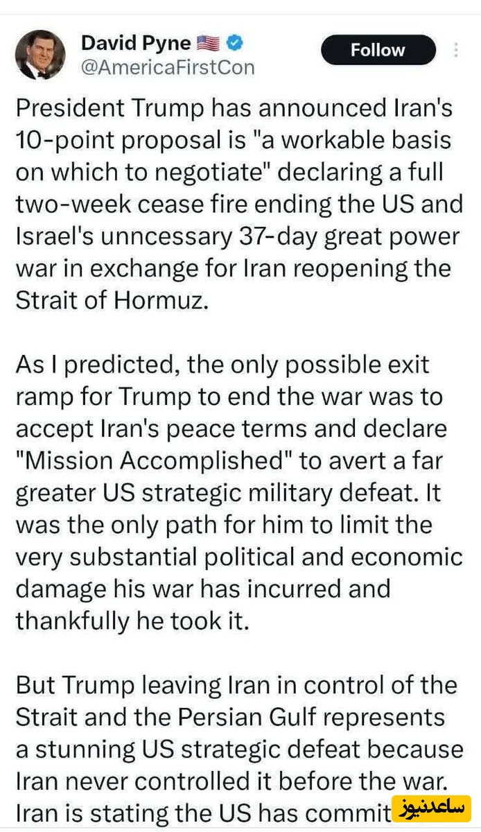🔹طرح آتشبس دو هفتهای شامل اجازه دادن به ایران و عمان برای گرفتن هزینه از کشتیهایی است که از تنگه هرمز عبور میکنند. ایران این اموال را در بازسازی استفاده خواهد کرد.
