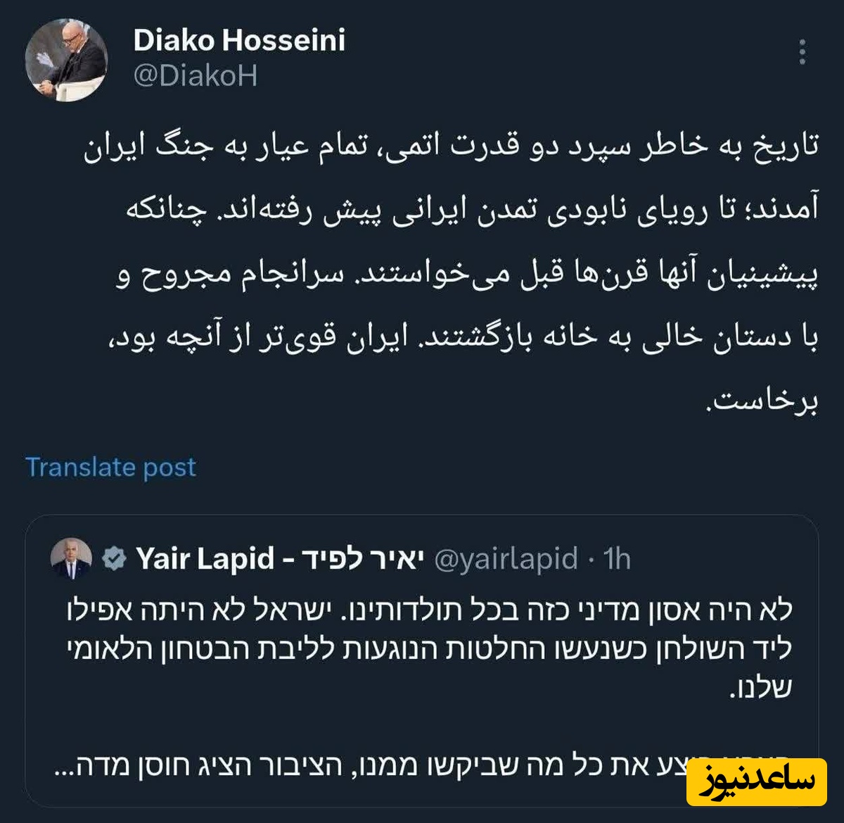 🔹سالها طول خواهد کشید تا خسارات سیاسی و راهبردی که نتانیاهو به دلیل تکبر، سهلانگاری و فقدان برنامهریزی استراتژیک به بار آورده است را جبران کنیم.
