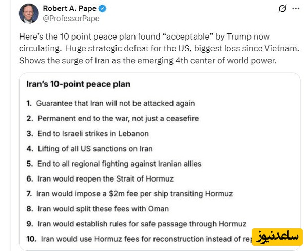 استاد دانشگاه شیکاگو درباره طرح 10 بندی تحمیلی ایران به ترامپ نوشت: «(این) نشاندهنده ظهور ایران به عنوان چهارمین مرکز قدرت جهانی در حال ظهور است.»