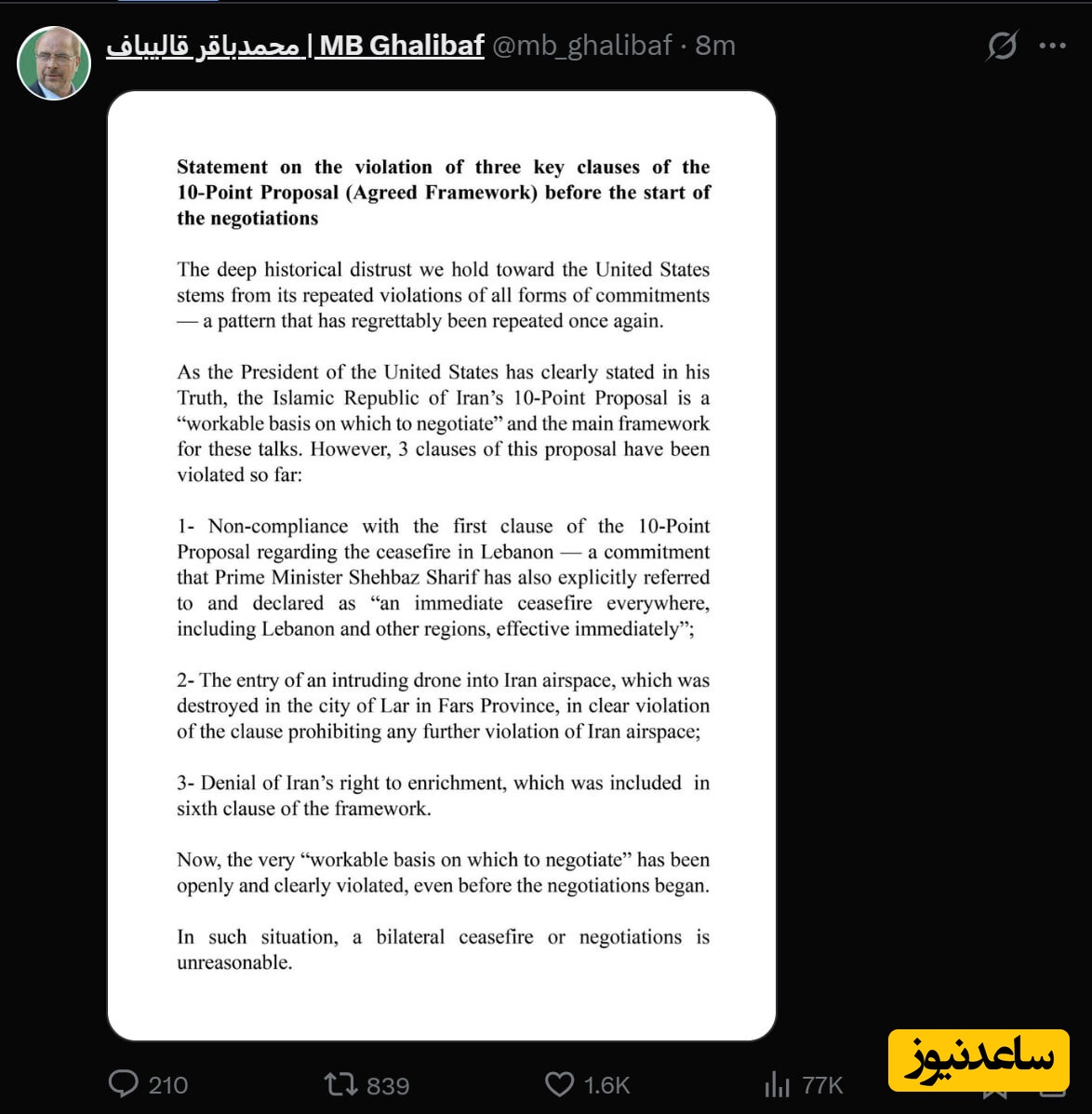 به گزارش سرویس سیاست پایگاه خبری ساعدنیوز، محمدباقر قالیباف، رئیس مجلس به زبان انگلیسی یک مطلب در توییتر خود درباره مذاکره و آتشبس با آمریکا منتشر کرد: