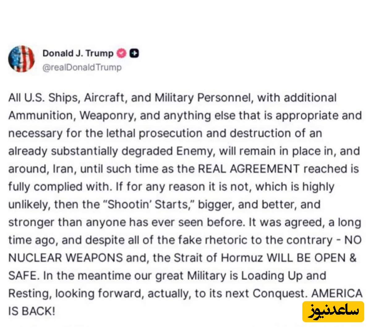 ترامپ دقایقی پیش در پیامی که در شبکه اجتماعی تروث سوشال منتشر کرد، نوشت «تا زمانیکه توافق واقعی به طور کامل اجرا شود، تمام کشتیها، هواگردها و پرسنل نظامی آمریکا، همراه با مهمات، تسلیحات و هر چیز دیگری که برای اجرای مرگبار و نابودی کامل دشمنی که پیشتر به طرز قابل ملاحظهای تضعیف شده، مناسب و ضروری باشد، در داخل و اطراف ایران در جای خود باقی خواهند ماند. در حال حاضر ارتش ما هم در حال آمادهسازی است، هم استراحت میکند، اما حقیقت این است که منتظر فتح نظامی بعدی است. آمریکا دوباره قدرتمند شده است.