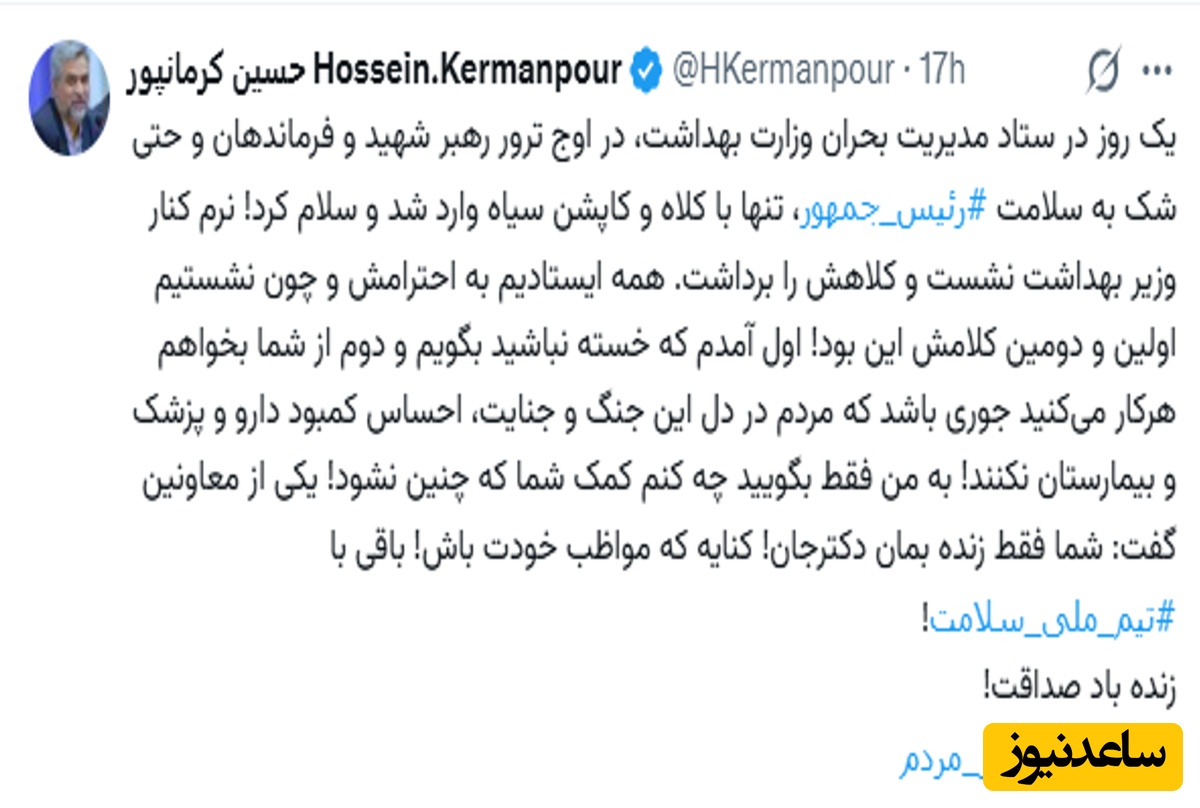 یک روز در ستاد مدیریت بحران وزارت بهداشت، در اوج ترور رهبر شهید و فرماندهان و حتی شک به سلامت #رئیسجمهور، تنها با کلاه و کاپشن سیاه وارد شد و سلام کرد! نرم کنار وزیر بهداشت نشست و کلاهش را برداشت. همه ایستادیم به احترامش و چون نشستیم اولین و دومین کلامش این بود! اول آمدم که خسته نباشید بگویم و دوم از شما بخواهم هرکار میکنید جوری باشد که مردم در دل این جنگ و جنایت، احساس کمبود دارو و پزشک و بیمارستان نکنند! به من فقط بگویید چه کنم کمک شما که چنین نشود! یکی از معاونین گفت: شما فقط زنده بمان دکترجان! کنایه که مواظب خودت باش! باقی با #تیمملی_سلامت!