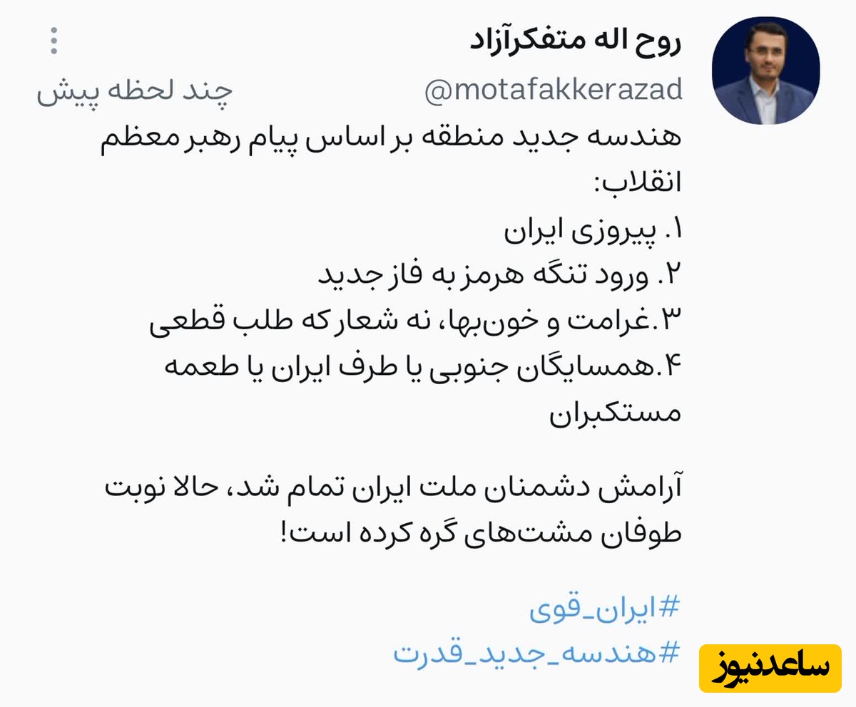 به گزارش سرویس سیاست پایگاه خبری ساعدنیوز، روحالله متفکرآزاد در تازهترین پیام خود در فضای مجازی، به تبیین شرایط و مناسبات جدید قدرت در خاورمیانه پرداخت و محورهای اصلی این تغییرات را تحت عنوان «هندسه جدید منطقه» و با استناد به پیام رهبر معظم انقلاب بیان کرد.
