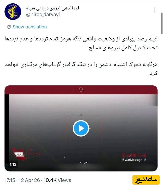 به گزارش سرویس سیاست پایگاه خبری ساعدنیوز، فرماندهی نیروی دریایی سپاه پاسداران انقلاب اسلامی با انتشار ویدئویی از رصد پهپادی تنگه هرمز در حساب کاربری خود در شبکه اجتماعی ایکس نوشت: