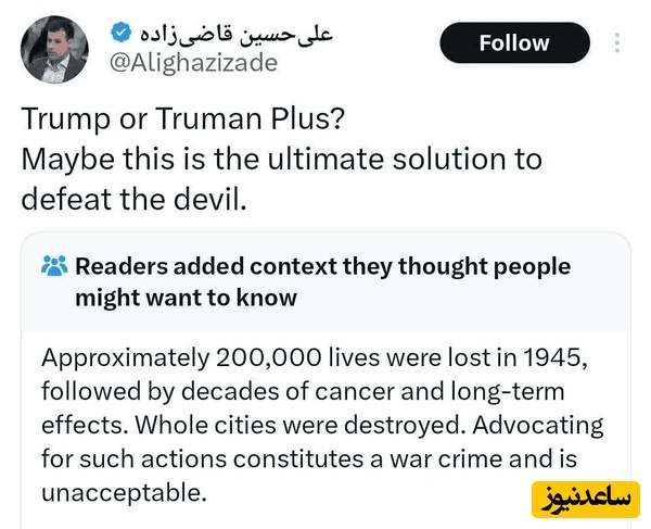 علیحسین قاضیزاده، مجری و عضو تحریریه شبکه صهیونیستی اینترنشنال، در پستی در شبکه ایکس، با استفاده از عبارت «ترومن پلاس» به استقبال سناریویی رفته است که معنایی جز نابودی کامل جغرافیای ایران ندارد. او در حالی از مدل «هری ترومن» (تنها رئیسجمهوری که دستور حمله اتمی را صادر کرد) آن هم در نسخه ارتقایافته یا پلاس سخن میگوید که این واژه در تاریخ سیاسی جهان یادآور خاکسترشدن صدها هزار غیرنظامی در هیروشیما و ناکازاکی است. بمب اتم و راهکار «ترومنی»، تفکیکی میان سیاست، رژیم و جغرافیا و مردم قائل نیست. این یعنی دعوت به قتلعام میلیونها نفر در جغرافیای ایران و نابودی سرزمینی که اپوزیسیون، مدعی نجات آن هستند.