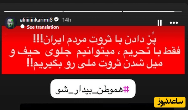 پیش از این نیز علی کریمی به بهانه انتقاد از عملکرد بابک زنجانی با استوری مطلبی در صفحه اینستاگرامش نوشت: «فقط با تحریم، میتوانیم جلوى حیفومیل شدن ثروت ملی را بگیریم. #هموطن_بیدار_شو»