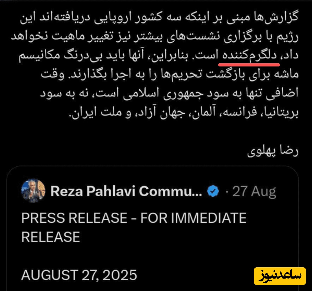 سال گذشته نیز در آستانه فعال شدن مکانیسم ماشه، رضا پهلوی در توییتی فعال شدن مکانیسم ماشه را «دلگرمکننده» خواند و نوشت: «آنها (اروپا) باید بیدرنگ مکانیسم ماشه برای بازگشت تحریمها را به اجرا بگذارند.»