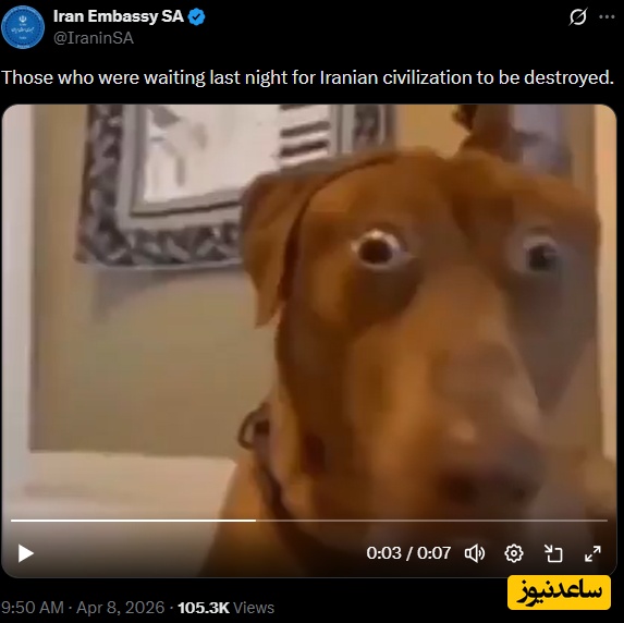 پس از 24 ساعت، این ویدئو بیش از 45 هزار لایک گرفت. درست همان شبی که ترامپ ادعا کرد که میخواهد تمدن ایران را نابود کند، همان سفارت ویدئویی منتشر کرد که در آن سگی با نگاهی متعجب به دوربین خیره شده و هیچ اتفاقی نمیافتد.