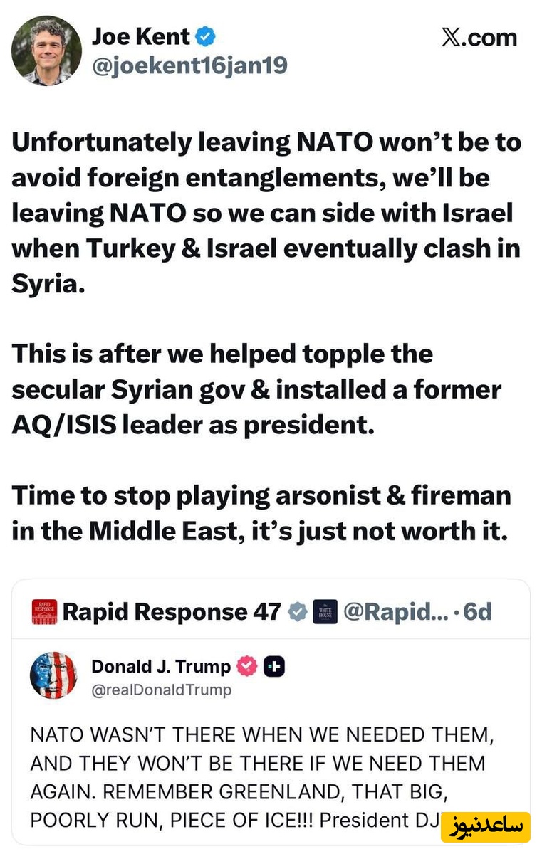 به گزارش سرویس سیاست پایگاه خبری تحلیلی ساعدنیوز، رییس سابق مرکز مبارزه با تروریسم آمریکا خطاب به ترامپ نوشت: متاسفانه خروج از ناتو برای دوری از درگیریهای خارجی نخواهد بود، ما ناتو را ترک خواهیم کرد تا وقتی ترکیه و اسرائیل در نهایت در سوریه با هم درگیر شدند، بتوانیم در کنار اسرائیل قرار بگیریم.