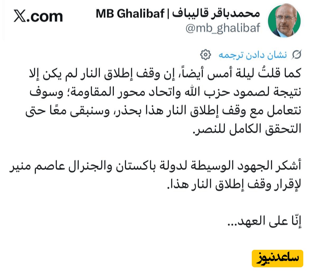 به گزارش سرویس سیاسی پایگاه خبری ساعدنیوز، محمد باقر قالیباف رئیس مجلس شورای اسلامی در حساب کاربری خود در شبکه اجتماعی ایکس، نوشت: همانطور که دیشب گفتم، آتشبس تنها نتیجۀ پایداری حزبالله و وحدت محور مقاومت بود.