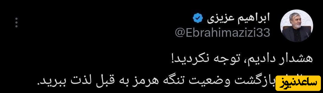 به گزارش سرویس سیاست پایگاه خبری تحلیلی ساعدنیوز، پس از خبر بسته شدن مجدد تنگه هرمز ابراهیم عزیزی رئیس کمیسیون امنیت ملی مجلس در توئیتی نوشت:
