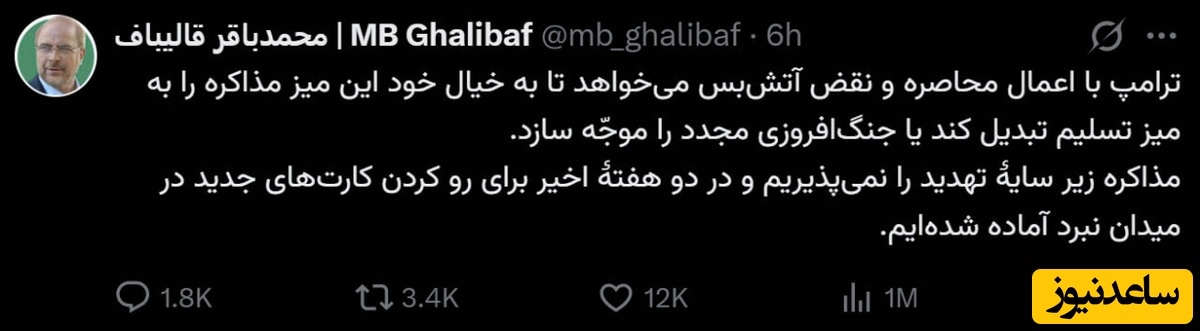 به گزارش سرویس سیاست پایگاه خبری ساعدنیوز، محمدباقر قالیباف رئیس مجلس شورای اسلامی در فضای مجازی نوشت: «ترامپ با اعمال محاصره و نقض آتشبس میخواهد تا به خیال خود این میز مذاکره را به میز تسلیم تبدیل کند یا جنگافروزی مجدد را موجه سازد.