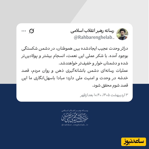 به گزارش سرویس سیاست پایگاه خبری ساعدنیوز، سیاسی فارس، رسانه رهبر انقلاب اسلامی پس از انتشار متن مشترک سران قوا و دیگر مسئولین ارشد کشور در پاسخ به اختلاف افکنی ترامپ، بخشی از پیام نوروزی حضرت آیتالله سیدمجتبی حسینی خامنهای رهبر معظّم انقلاب را در شبکه اجتماعی ایکس منتشر کرد.