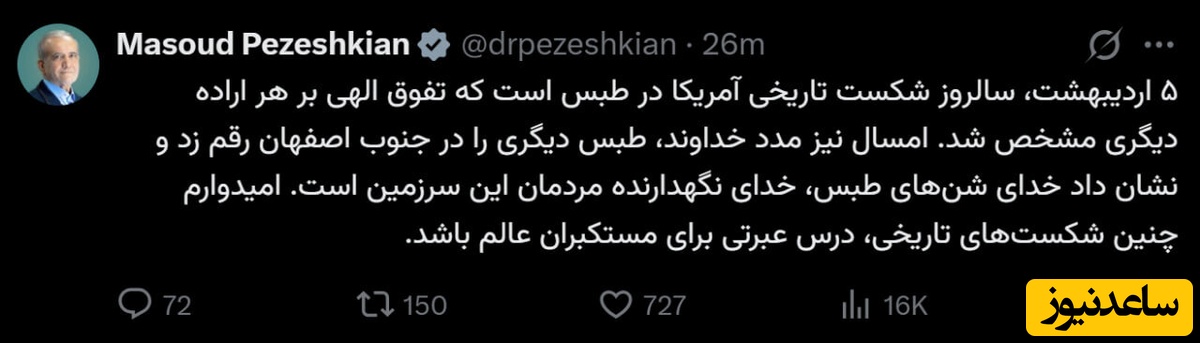 به گزارش سرویس سیاست پایگاه خبری ساعدنیوز، مسعود پزشکیان، رئیس جمهور در توییتر خود نوشت: 5 اردیبهشت، سالروز شکست تاریخی آمریکا در طبس است که تفوق الهی بر هر اراده دیگری مشخص شد. امسال نیز مدد خداوند، طبس دیگری را در جنوب اصفهان رقم زد و نشان داد خدای شنهای طبس، خدای نگهدارنده مردمان این سرزمین است. امیدوارم چنین شکستهای تاریخی، درس عبرتی برای مستکبران عالم باشد.