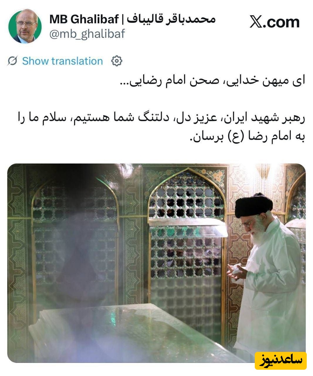 به گزارش سرویس سیاسی پایگاه خبری تحلیلی ساعدنیوز، محمدباقر قالیباف رئیس مجلس با انتشار تصویری از رهبر شهید انقلاب در حرم امام رضا (ع) نوشت: