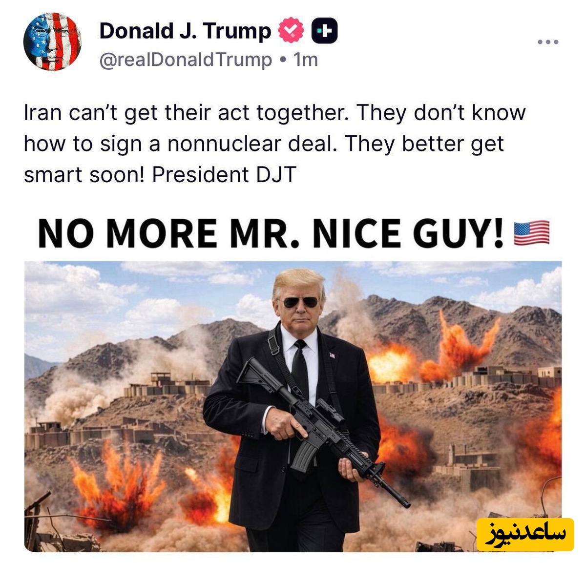 به گزارش سرویس سیاست پایگاه خبری ساعدنیوز، ترامپ اینبار ایران را با عکس فتوشاپی از خودش تهدید کرد: