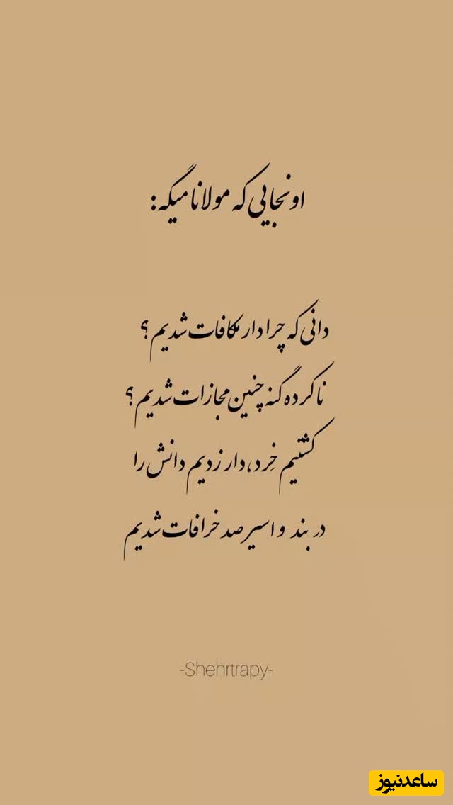 به گزارش سرویس جامعه ساعدنیوز، این بیت مشهور، که اغلب به عنوان شعری انتقادی_اجتماعی به مولانا نسبت داده میشود (هرچند در دیوانهای اصلی او یافت نشده)، دلیلی بر وضعیت ناگوار و مجازاتهای بیدلیل (ناکرده گنه) را کشتن خرد، دار زدن دانش، و اسیر شدن در بند خرافات میداند. این شعر بر اهمیت عقلانیت و آگاهی تاکید دارد.