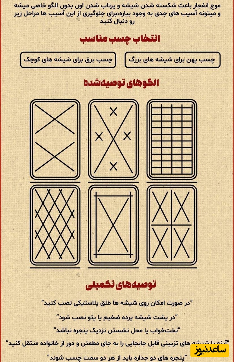 به گزارش سرویس جامعه ساعدنیوز به نقل از همشهری، تصویر پیشرو مجموعهای از الگوهای کاربردی برای چسب زدن شیشه پنجرهها را نمایش میدهد؛ راهکاری ساده اما مؤثر برای کاهش خطرات ناشی از موج انفجار.