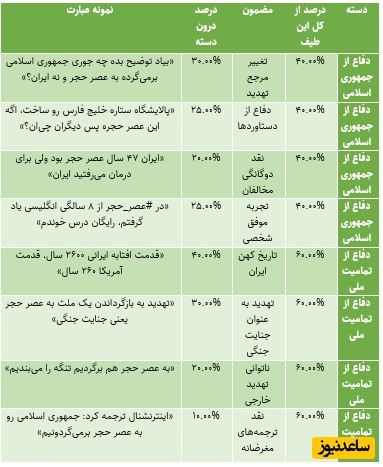 در این گزارش، این دو دسته به تفکیک تحلیل شده و درصد هر مضمون ارائه میگردد.