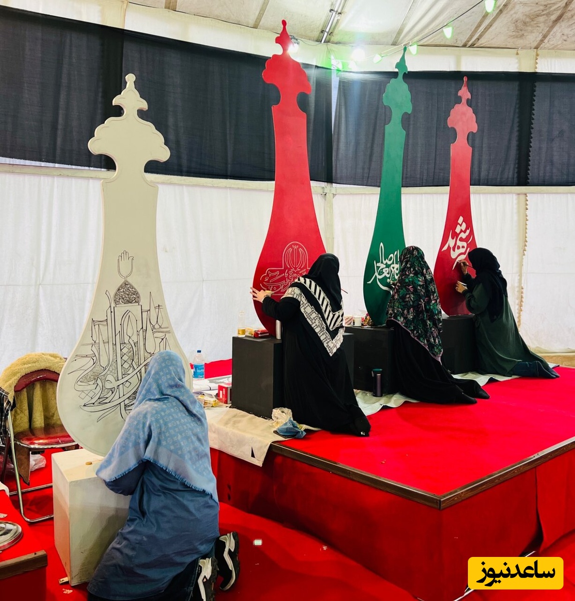 به گزارش سرویس جامعه ساعدنیوز به نقل از همشهری، میدان هفت تیر در میانه مسیرهای پررفتوآمد شهری است. از ابتدای تعطیلات عید خیمهای سر به آسمان بلند کرد که سالهای قبل درماه محرم برپا میشد. خیمه سفید رنگی که روی آن نام یکی از ائمه نوشته شده است. عمود خیمه ستونی بزرگ و محکم است که با پیچ به پایه درون زمین بسته شده و ارتفاع سقف را تا 18 متر بالا برده است. 700 مترمربع مساحت کف خیمه، کفپوش قرمز رنگی دارد و در گوشه آن منبر چوبی سخنرانی قرار گرفته اما آنچه اینجا را تبدیل به کارگاه و نمایشگاه آثار هنری میکند سکوهایی هستند که هر یک به کاری اختصاص یافته است.