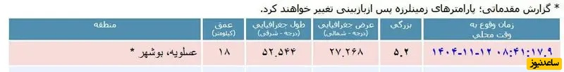 به گزارش سرویس حوادث ساعدنیوز، زمین لرزه ای به بزرگی 5.2 ریشتر امروز، 12 بهمن 1404، در ساعت 08:41:17، منطقه عسلویه در استان بوشهر را به لرزه درآورد. مرکز این زمین لرزه در عمق 18 کیلومتری زمین و در فاصله 24 کیلومتری از شهر عسلویه قرار داشته است.