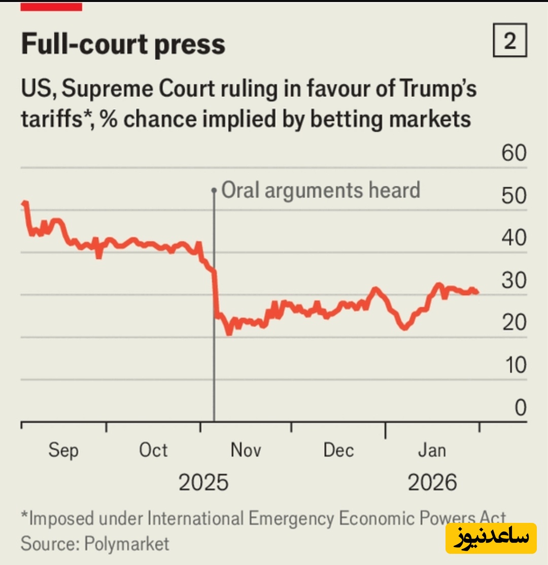 دلیل دیگری که نشان میدهد درآمدهای تعرفهای دیگر بالا نمیرود، دیوان عالی است. بخش اعظمِ تعرفههای آقای ترامپ، بهطور غیرمعمول، با استناد به قانون اختیارات اقتصادی اضطراری بینالمللی (IEEPA) وضع شده است؛ قانونی که برای پوشش محدودیتهای تجاری در مواردِ حالت اضطراریِ ملی نوشته شده است. (رئیسجمهور، با استدلالی قابل تردید، گفته است کسریهای تجاری خود یک بحران بهشمار میآیند.) در نوامبرِ 2025 (حدوداً آبان/آذر 1404) وکلای آقای ترامپ در جریان استدلالات شفاهی از سوی قضات مورد بازخواست قرار گرفتند. بازارهای شرطبندی اکنون احتمالِ اینکه دادگاه این استفاده از IEEPA را قانونی بداند تنها حدود 30٪ میدانند ( نمودار 2). هرچند آقای ترامپ اختیارهای قانونی دیگری هم برای راهاندازی جنگ تعرفهای دارد، هیچیک به اندازهٔ IEEPA وسیع نیست. پیامدِ حکمی علیهِ عوارضِ او احتمالاً ایجادِ یک سامانهٔ تعرفهای دستوپاگیرتر ،و احتمالاً کمدرآمدتر، خواهد بود.